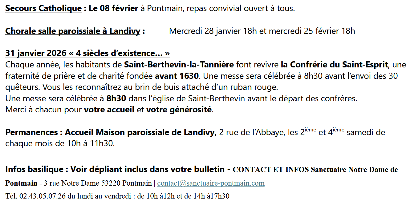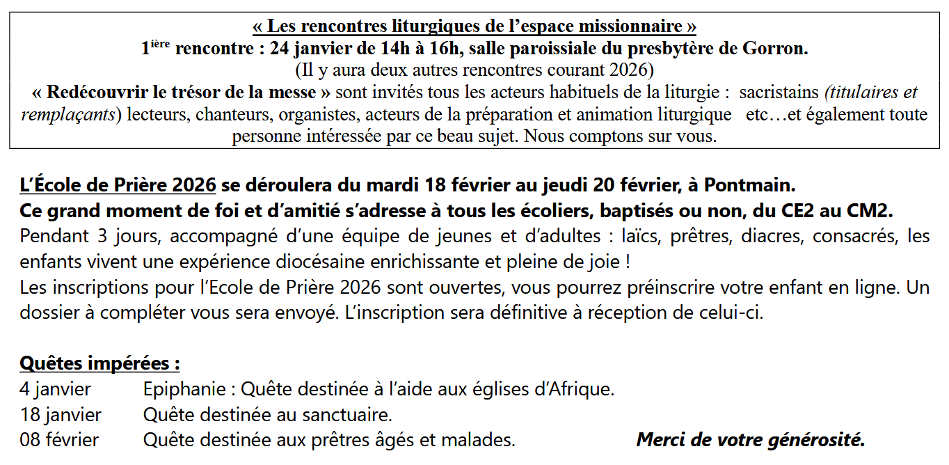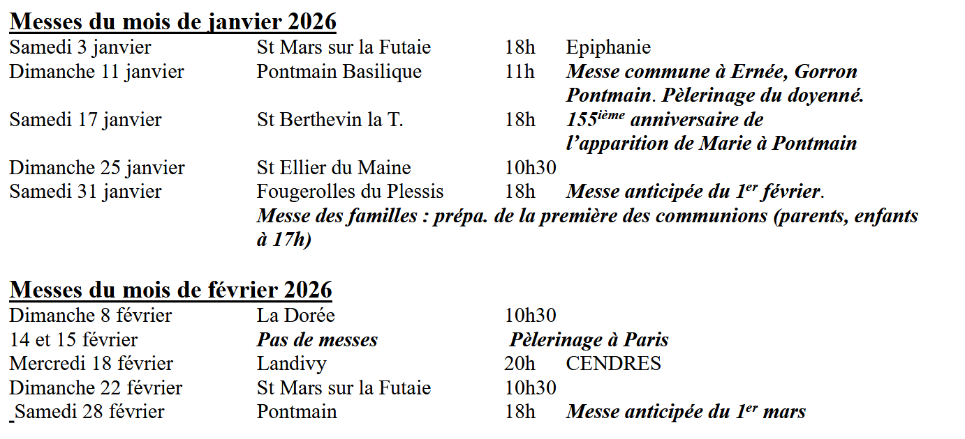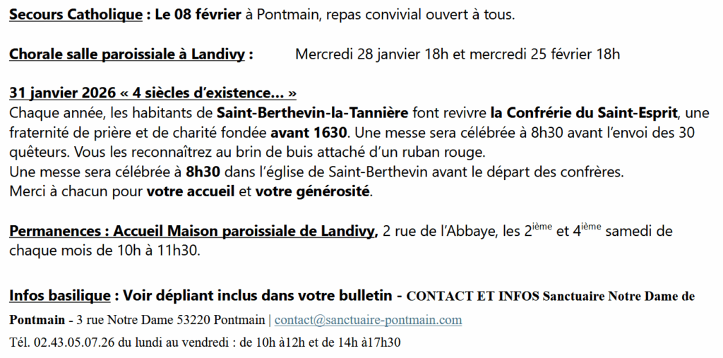 Page d'accueil » Bulletin paroissial » Agenda janvier-février Agenda janvier-février par Paroisse Notre Dame de Pontmain le janvier 1, 2026 dans Bulletin paroissial À NOTER DANS LA PAROISSE Article précédentCe qui s’est passé… Article suivantChronique de l’Espace Missionnaire